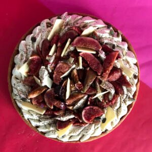 Sur la base d’une pâte croustillante, d’une crème noisette, une marmelade de figue, une ganache au citron vert et de figues rôties au miel.
